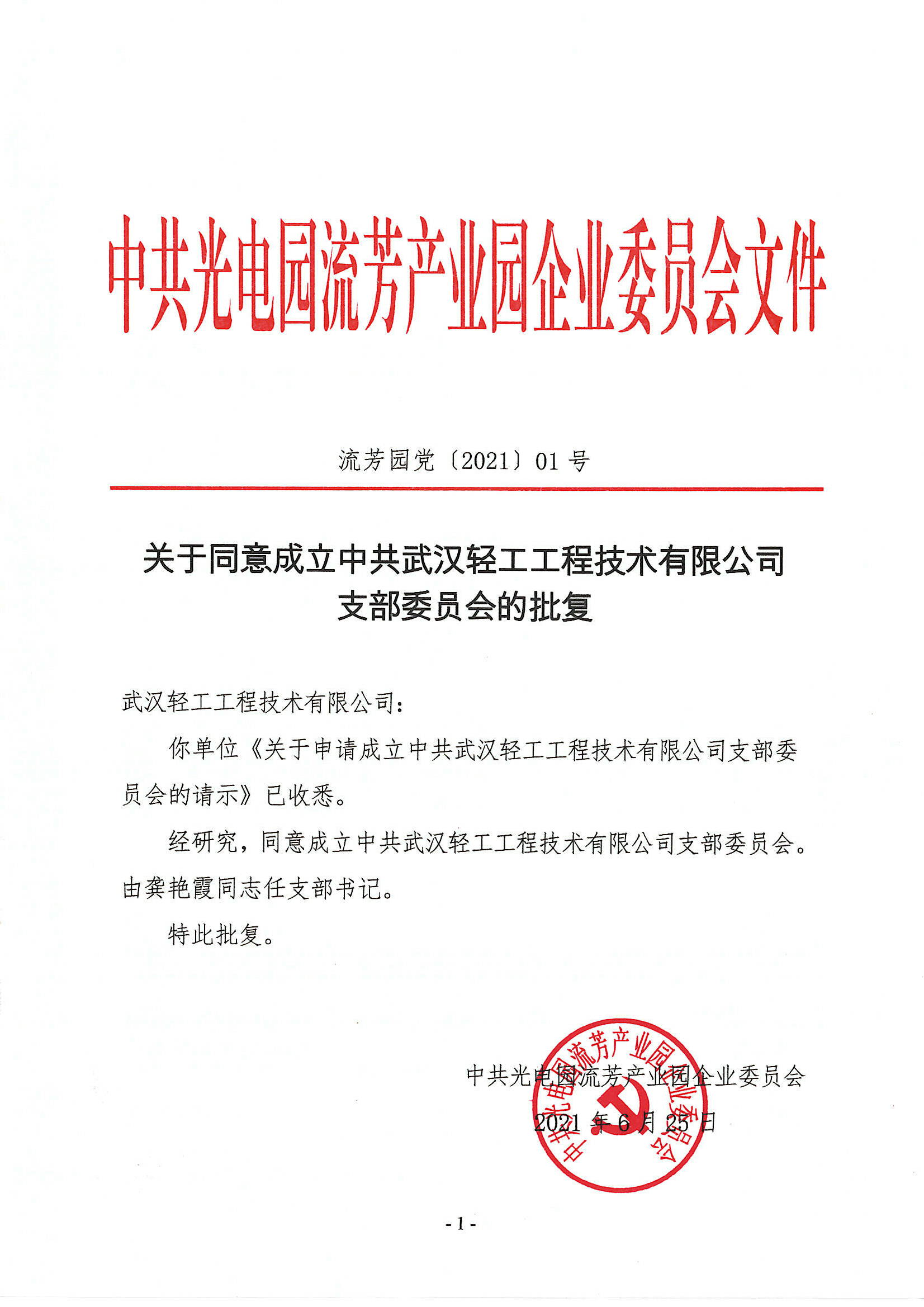 中共光電園流芳產(chǎn)業(yè)園企業(yè)委員會江峰書記宣布:經(jīng)多方面核實,武漢輕工工程技術有限公司員工整體思想認識較高,業(yè)務能力較強,生活上相互關心,同事之間相處融洽,充分發(fā)揚了黨組織戰(zhàn)斗堡壘與黨員在群眾中的模范帶頭作用,同時規(guī)范黨員組織生活,加強對黨員同志的組織管理,從而增強了公司員工的凝聚力;按照黨章及有關規(guī)定,結合公司實際情況,同意成立“中共武漢輕工工程技術有限公司支部委員會”。